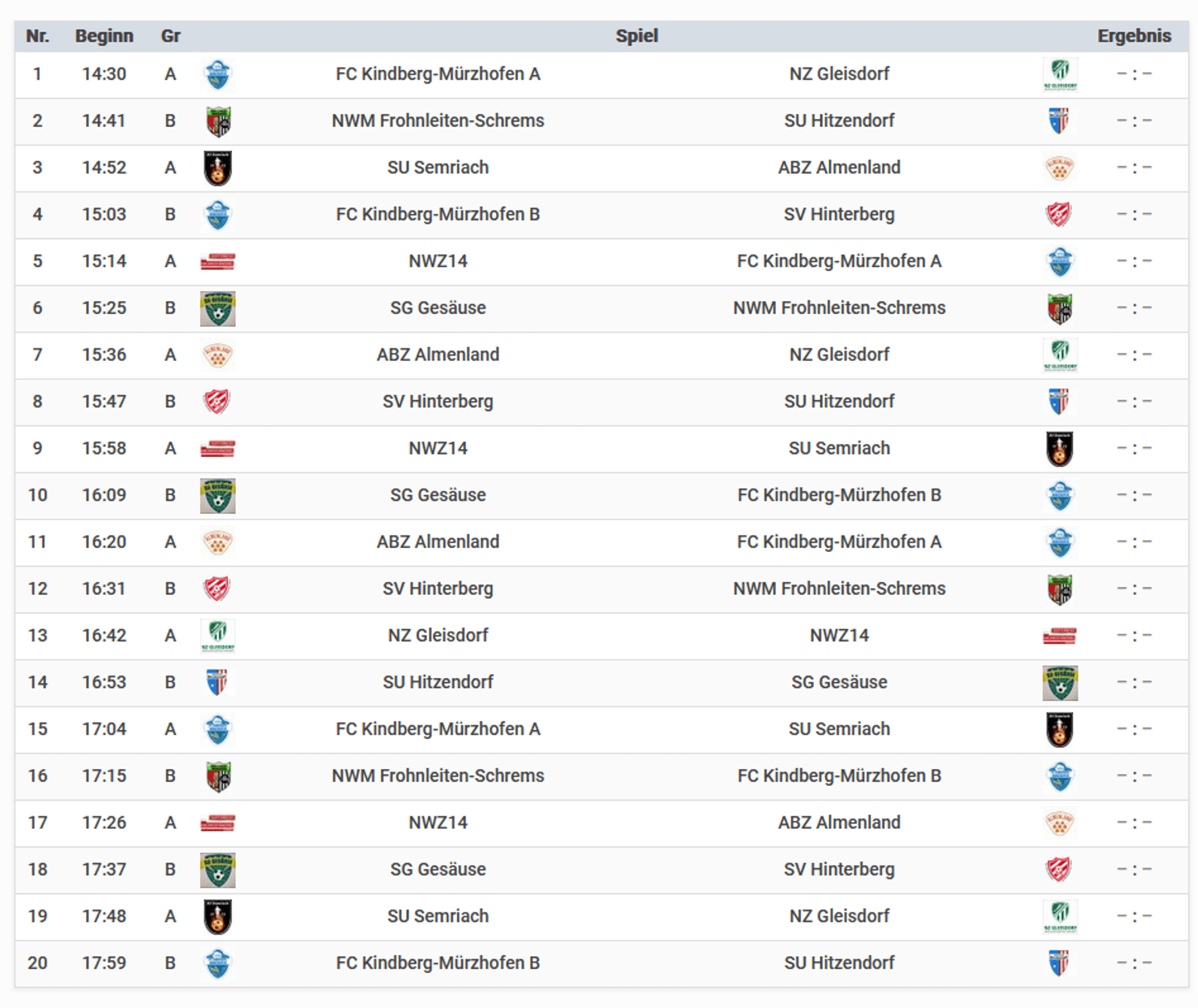 Gruppe A: FC Kindberg-Mürzhofen A, SU Semriach, ABZ Almenland, NWZ 14, NZ Gleisdorf